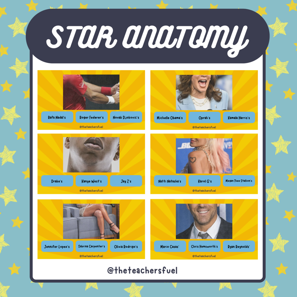 In this game, students first identify body parts or physical features presented on the slides using varying levels of vocabulary. After discussing the description, they then select the correct celebrity whose features match the description from three provided photos. This activity not only reinforces vocabulary related to body parts and physical descriptions but also practices the use of the possessive 's'.