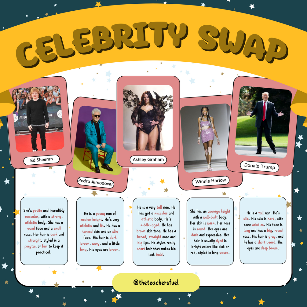 Celebrity Swap is a version of the classic Memory Matching game where students take turns guessing which celebrity matches their physical description.